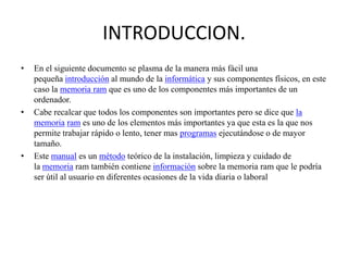 El documento describe diferentes tipos de memoria utilizados en computadoras. Explica que la memoria RAM se usa para almacenar temporalmente programas y datos durante el funcionamiento del computador, mientras que la memoria ROM conserva su contenido incluso cuando el computador está apagado y se usa comúnmente para almacenar software crítico como el sistema operativo. También cubre brevemente los tipos SIMM, DIMM y PROM de módulos de memoria RAM y usos comunes de la memoria ROM en dispositivos electrónicos.