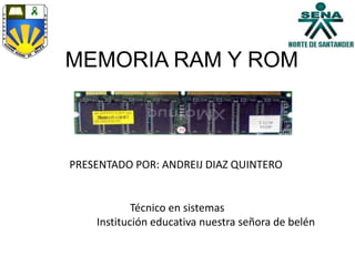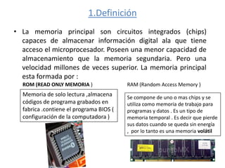 La memoria RAM y ROM son circuitos integrados que almacenan información digital para el microprocesador. La ROM almacena códigos de programa de forma permanente, mientras que la RAM es una memoria temporal que pierde los datos cuando no tiene energía. Existen diferentes módulos y tecnologías de RAM como SDRAM, DDR, DDR2 y DDR3 que mejoran el rendimiento al aumentar la velocidad de transferencia de datos. La RAM se instala en los slots de la placa base de la computadora.