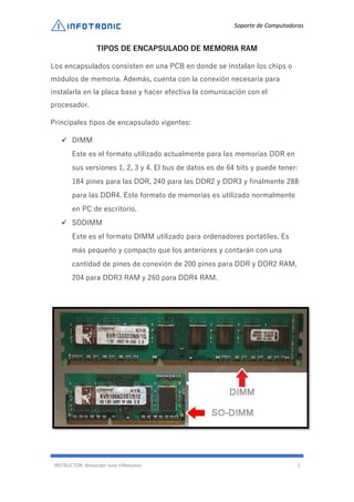 Este documento describe los diferentes tipos de memoria RAM, incluyendo DDR, DDR2, DDR3 y DDR4. Explica las características clave de cada tipo como el encapsulado, velocidad, voltaje y capacidad. También destaca que aunque los módulos pueden parecer similares, existen diferencias físicas que impiden mezclar diferentes generaciones de RAM.