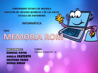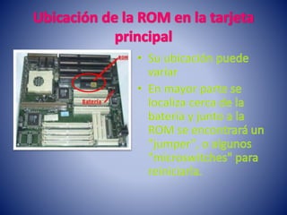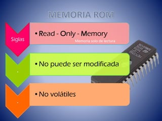Este documento describe diferentes tipos de memoria ROM, incluyendo PROM, EPROM, EEPROM y memoria flash. Explica que la memoria ROM almacena datos de forma permanente incluso cuando se apaga la computadora. También describe las características y usos de cada tipo de memoria ROM.