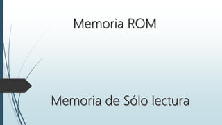 La memoria ROM almacena información de forma permanente y se utiliza para arrancar el ordenador. Existen diferentes tipos de memoria ROM como la ROM, PROM, EPROM, EEPROM y FLASH ROM. La ROM original se programaba directamente en silicona, mientras que la PROM y EPROM se pueden programar y borrar mediante voltaje o luz UV respectivamente. La EEPROM y FLASH ROM permiten borrar y reprogramar la memoria de forma eléctrica.