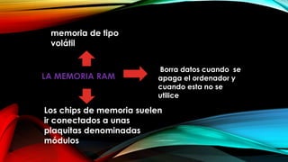 Este documento describe diferentes tipos de memoria utilizados en computadoras. Explica que la memoria RAM es volátil y almacena datos temporalmente mientras la computadora está encendida. Luego describe la memoria SRAM como más rápida que la DRAM pero también más costosa y con menos capacidad de almacenamiento. Finalmente, cubre otros tipos como SDRAM, VRAM y RDRAM.