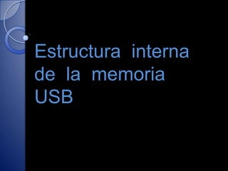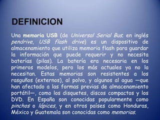 Las partes principales de una memoria USB incluyen un conector USB, un controlador de almacenamiento masivo USB, un circuito de memoria flash, un oscilador de cristal y LEDs. Las memorias USB almacenan datos de forma segura y portátil y se han convertido en el método principal de almacenamiento y transporte de datos personales.