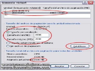 La memoria virtual es una técnica de administración de memoria que permite al sistema operativo usar el disco duro como memoria RAM adicional cuando la memoria física se agota. Mueve datos entre la RAM y un archivo de paginación en el disco duro para liberar espacio en la RAM y permitir que las tareas se completen. El documento explica cómo aumentar el tamaño de la memoria virtual en Windows moviendo datos entre la RAM y el disco duro para mejorar el rendimiento cuando falta memoria física.