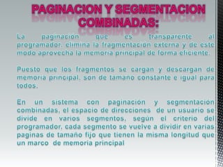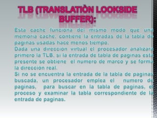 1. Los algoritmos de sustitución de páginas se dividen en básicos, aproximaciones LRU y de conteo. 2. Tienen como objetivo obtener la tasa más baja posible de fallos de páginas al ejecutar una cadena de referencias de memoria. 3. La asignación de memoria en un sistema con memoria virtual implica asignar un número de marcos a cada proceso en función del tipo de aplicación.