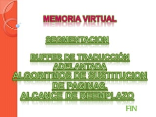 Este documento describe varios algoritmos de sustitución de páginas. Se dividen en algoritmos óptimos pero imposibles de implementar, como el algoritmo de la página más alejada, y algoritmos factibles como FIFO, LRU y clock. También describe políticas de asignación de memoria como asignación fija y variable.