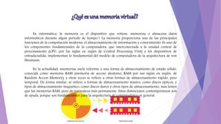 El documento describe diferentes tipos de memoria utilizados en computadoras. Explica que la memoria RAM se utiliza como memoria de trabajo y es volátil, mientras que la memoria ROM almacena información de forma permanente pero solo permite lectura. También describe otros tipos de memoria como EPROM, EEPROM, caché y las tarjetas SD utilizadas para almacenamiento portátil.