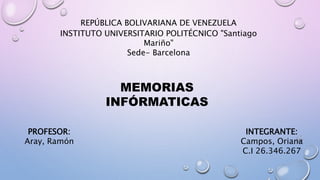 Este documento describe los diferentes tipos de memoria utilizados en computadoras, incluyendo RAM, ROM, PROM, EPROM, EEPROM y memoria flash. Explica que la memoria almacena datos e instrucciones y que la memoria principal almacena la información de los programas en ejecución. También incluye una tabla comparativa de las características de los diferentes tipos de memoria.