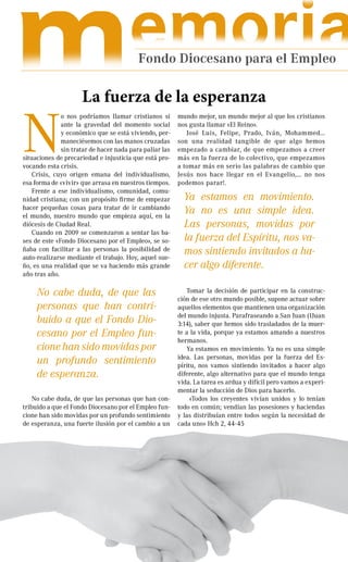 El documento describe las actividades del Fondo Diocesano por el Empleo en Ciudad Real, que ofrece microcréditos de hasta 5.000€ sin intereses para ayudar a personas desempleadas a crear o mantener su propio negocio. En 2012 se concedieron 19 microcréditos por un total de 83.500€, principalmente para la creación de pequeños comercios y negocios de servicios. Gracias a las donaciones y devoluciones de préstamos anteriores, el Fondo contaba a finales de año con 92.162,66€ para seguir