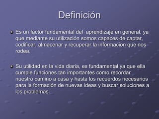 Este documento describe la memoria humana, incluyendo su definición, estructura y funcionamiento. Explica que la memoria consta de tres partes principales: memoria sensorial, memoria de corto plazo y memoria de largo plazo. También cubre temas como la codificación, el almacenamiento, la recuperación de la memoria, y factores que afectan la memoria como el olvido y las distorsiones.