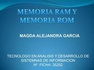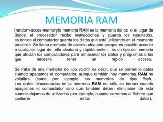 La memoria RAM almacena datos e instrucciones de forma temporal para su uso inmediato por el procesador. Es una memoria de acceso aleatorio y volátil que se borra cuando se apaga el equipo. La memoria ROM almacena datos de forma permanente y solo permite lectura de la información. Existen diferentes tipos de RAM y ROM que se diferencian en su capacidad de escritura y borrado.
