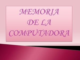 El documento habla sobre la memoria de la computadora. Explica que existen tres tipos principales de memoria: la memoria RAM, la memoria ROM y la memoria caché. La memoria RAM es volátil y se usa para almacenar datos de forma temporal, mientras que la memoria ROM es de solo lectura y contiene información permanente como el BIOS. La memoria caché ayuda a acelerar el acceso a los datos al almacenar de forma temporal datos de la RAM para su uso frecuente.