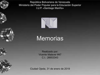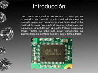 El documento detalla los distintos tipos de memoria que existen en las computadoras, incluyendo memoria RAM, ROM, SRAM, y memoria caché, explicando sus funciones y características. Se destaca la importancia de la memoria RAM para el funcionamiento temporal de las aplicaciones, mientras que la ROM almacena instrucciones permanentes esenciales para el arranque del sistema. Además, se presentan las diferencias entre estos tipos de memoria, así como la evolución de los módulos de memoria como SIMM y DIMM.