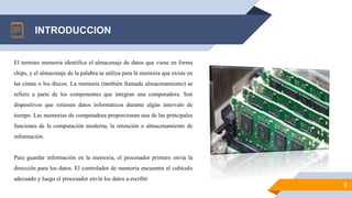 El documento aborda la naturaleza y función de la memoria en computadoras, explicando tipos como RAM, ROM y sus variantes, así como su importancia en el almacenamiento de datos. Se describen las características y funciones de memorias como SRAM, DRAM, y las reprogramables como EEPROM y Flash. Además, se menciona la evolución histórica y técnica del almacenamiento, desde los circuitos integrados hasta los microchips utilizados en dispositivos modernos.