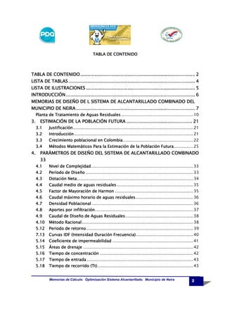 Este documento presenta las memorias de cálculo para el diseño del sistema de alcantarillado combinado del municipio de Neira. Describe el diagnóstico actual del sistema, incluyendo la extensión, diámetros y materiales de las redes, puntos de vertimiento, y la ausencia de una planta de tratamiento. Explica los parámetros de diseño como dotación neta, caudales, pendientes, diámetros y velocidades requeridos. Finalmente analiza las redes de alcantarillado proyectadas.