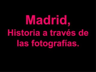 Este documento presenta una serie de fotografías que muestran la evolución de Madrid a lo largo del siglo XX, desde escenas de la vida cotidiana en la ciudad en la década de 1890 hasta manifestaciones políticas en la década de 1960. Las fotografías capturan obras de construcción y renovación urbana, la vida durante la guerra civil española, la posguerra y el desarrollo posterior de la ciudad. En conjunto, el documento ofrece una mirada histórica a cómo Madrid creció y cambió a través de los años en el siglo pasado