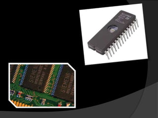 Los componentes fundamentales de las computadoras son la CPU, la memoria y los dispositivos de entrada/salida. La memoria primaria está directamente conectada a la CPU, mientras que la memoria secundaria y terciaria requieren canales de entrada/salida. Existen diferentes tipos de memorias como la memoria de semiconductor, magnética, óptica y magnetoóptica, que pueden ser volátiles o no volátiles y de acceso aleatorio o secuencial.