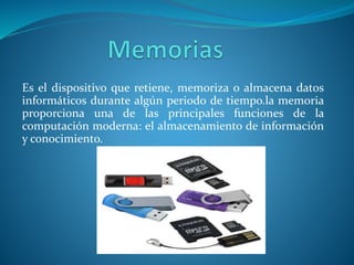 El documento describe los principales componentes de hardware de una computadora, incluyendo la memoria (RAM, ROM, DRAM, SRAM), tarjetas, CPU, puertos, bus de datos, motherboard, procesador (velocidad en Hz, MHz, GHz) y fuente de poder. Explica las funciones básicas de cada componente y cómo interactúan entre sí para que la computadora funcione.
