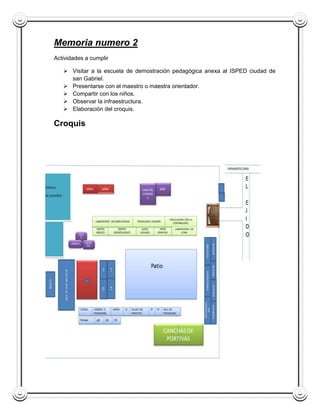 El documento contiene tres memorias de una práctica pedagógica. La primera memoria describe las actividades realizadas en la escuela, incluyendo compartir con los niños y observar a la maestra. La segunda memoria incluye un croquis de la infraestructura de la escuela y describe los cargos y funciones del personal. La tercera memoria describe el horario de clases, cómo el maestro organiza su aula, y las actividades realizadas durante el día.