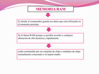 La memoria RAM almacena los datos que el computador está usando actualmente de forma rápida y aleatoria. Existen diferentes tipos como EDO RAM, DRAM y SDRAM que se han vuelto más rápidas y de mayor capacidad con el tiempo. La RAM es un componente fundamental para el funcionamiento del computador ya que es por donde circula gran cantidad de información.