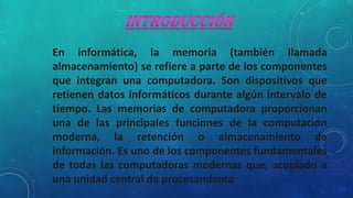 Este documento describe diferentes tipos de memoria en computadoras, incluyendo RAM, ROM, caché y sus características. La RAM es volátil y se usa para almacenar datos temporales, mientras que la ROM es de solo lectura y retiene datos cuando no hay energía. La memoria caché acelera el acceso a datos al almacenar instrucciones y datos usados recientemente.