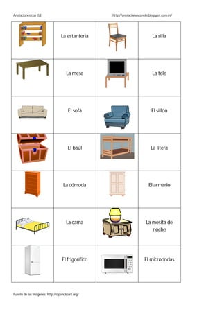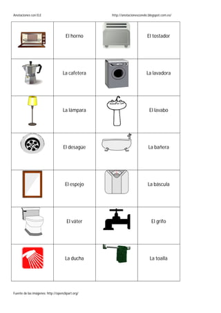 El documento presenta imágenes de objetos cotidianos de una casa como muebles, electrodomésticos y elementos de baño, con sus nombres en español debajo de cada imagen. Las imágenes incluyen artículos de cocina, sala, dormitorio, baño y lavandería con el propósito de enseñar el vocabulario doméstico en español.
