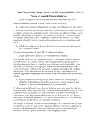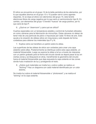 Este documento resume el proceso de fabricación de chips de silicio. Explica que usar obleas más grandes permite producir más chips. El silicio se purifica extrayendo otras sustancias de la arena a través de procesos químicos y físicos. El dopado introduce átomos que aportan electrones libres o huecos para hacer el silicio conductor. Los "cleanrooms" son salas limpias esenciales para fabricar chips libres de impurezas. Se transfiere un patrón a la oblea oxidada mediante luz y máscaras sobre un material