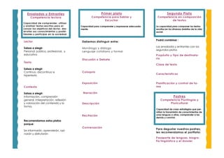 Este menú ofrece cuatro platos principales que representan las cuatro competencias lingüísticas: lectura, habla y escucha, escritura y plurilingüismo. Cada plato incluye breves descripciones de elementos clave dentro de su competencia correspondiente, como diferentes tipos de textos, formas de comunicación oral y estrategias para integrar varios idiomas. El menú concluye recomendando postres que refuerzan estas competencias a través de portafolios y otros recursos didácticos.