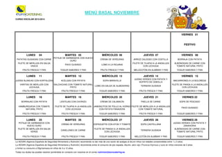 Este documento presenta el menú basal de noviembre para un colegio en el curso escolar 2013-2014. Cada día de la semana se detalla el primer y segundo plato, así como la fruta y postre. Algunos platos incluyen patatas guisadas con carne, pavo guisado, macarrones a la boloñesa y paella de carne. La Agencia Española de Seguridad Alimentaria y Nutrición recomienda no dar más de una ración de acelgas al día a niños de 1 a 3 años, y evitar el consumo de