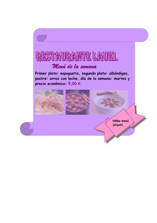El documento presenta los menús semanales de lunes a domingo de un restaurante, incluyendo el primer plato, segundo plato, postre, día de la semana y precio de cada uno. Los precios van desde 5€ a 7,50€.