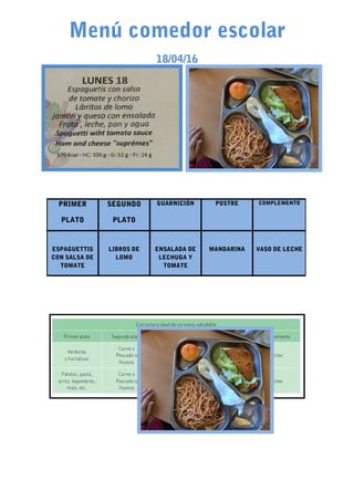 El menú escolar del 18 de abril de 2016 se considera saludable porque incluye hidratos de carbono en forma de espaguetis, carne en los libritos de lomo, y frutas y verduras como guarnición y postre, además de un vaso de leche. La única crítica es que los libritos de lomo podrían prepararse sin rebozado. En general, el menú cumple con las pautas del Programa Perseo para una alimentación equilibrada.