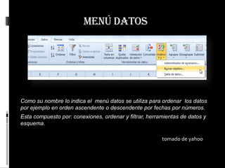 El documento explica las diferentes herramientas de datos en Excel como el menú datos, filtros, autofiltro, filtro avanzado y herramientas como consolidar, validación de datos y análisis, que permiten ordenar, buscar y analizar grandes cantidades de datos de manera eficiente.