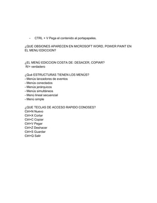 El documento describe la barra de menú, incluyendo cuatro tipos comunes de menús (normales, casillas de verificación, botones de radio y submenús), teclas de acceso directo comunes como Ctrl + C para copiar y Ctrl + V para pegar, y opciones comunes en el menú Edición de aplicaciones como Microsoft Word y PowerPoint como Deshacer y Copiar.