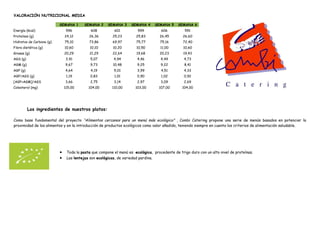 Este documento presenta un menú semanal para una cafetería escolar que promueve una alimentación más ecológica y local. El menú incluye platos como pasta ecológica con tomate, hamburguesas al horno, pollo en salsa de zanahoria y judías verdes con patata durante la semana 1. También proporciona un análisis nutricional promedio de cada semana. El objetivo del menú es utilizar ingredientes locales y ecológicos como la pasta y las lentejas ecológicas.