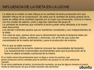 El documento discute los beneficios de amamantar al bebé durante sus dos primeros años de vida, señalando que esto reduciría el riesgo de otitis media aguda en un 50%, la gastroenteritis en un 64%, y el asma infantil en uno de cada cuatro casos. También habla sobre cómo la dieta de la madre influye en la cantidad y composición de la leche materna, y la importancia de que la madre tenga una alimentación balanceada durante la lactancia.