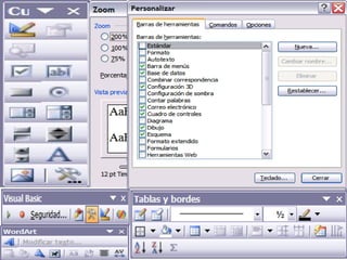 Este documento presenta las diferentes vistas disponibles en un procesador de texto como Microsoft Word. Explica las cinco vistas principales: Normal, Diseño Web, Diseño de impresión, Diseño de lectura y Esquema. Cada vista está diseñada para un propósito específico como escribir, modificar formatos, ver cómo se verá en la web o impreso, leer en pantalla y ver la estructura del documento. También describe las opciones disponibles en el submenú de barras de herramientas.