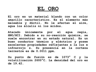 Este documento trata sobre la metalurgia del oro. Explica que el oro es un metal blando y amarillo que no se oxida con el aire, agua, ácidos o álcalis. Se encuentra comúnmente en su estado nativo o asociado a sulfuros metálicos o minerales carbonáceos. Los yacimientos de oro incluyen vetas de cuarzo aurífero, placeres aluviales y depósitos diseminados. El proceso de cianuración es el principal método para extraer el oro, dis