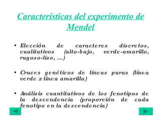 El documento resume los principales experimentos y hallazgos de Gregor Mendel sobre la herencia genética. Mendel estudió las proporciones de diferentes características en las generaciones filiales de guisantes y descubrió las leyes de la segregación y la independiente asociación de genes. Sus descubrimientos establecieron las bases de la genética mendeliana y proporcionaron una explicación cuantitativa de la herencia de características.