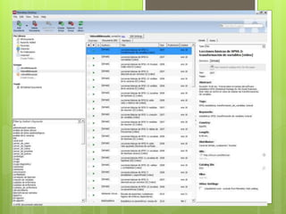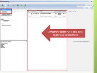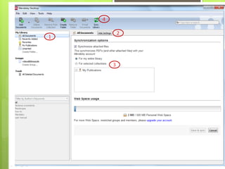 Este documento describe las funciones y uso del gestor bibliográfico Mendeley. Mendeley permite importar, organizar y citar referencias, así como extraer metadatos de archivos PDF. El documento explica cómo crear una cuenta, descargar la aplicación, añadir referencias manualmente o desde archivos PDF, sincronizar entre dispositivos, y exportar referencias a otros estilos de citación. También cubre cómo trabajar con documentos y referencias una vez cargadas, incluyendo añadir favoritos, ordenar, buscar y realizar anotaciones.