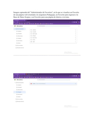 Este documento presenta los requisitos para una tarea de la asignatura Infopedagogía de la Universidad Nacional de Chimborazo. La tarea incluye capturas de pantalla que muestran favoritos relacionados con la pedagogía y bases de datos, así como páginas web, imágenes y PDF sobre turismo en Ecuador guardados en Diigo. También se requiere una captura de pantalla de una búsqueda de la palabra "turismo" en un sitio web de turismo ecuatoriano y la creación de un equipo de trabajo de dos integrantes.