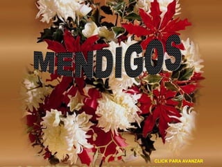 Este documento describe diferentes tipos de mendigos, incluyendo aquellos que parecen tener todo lo material pero carecen de amor y afecto, se sienten vacíos por dentro y anhelan un abrazo o consuelo. También habla de madres, abuelos y niños que a pesar de tener sus necesidades básicas cubiertas, se sienten abandonados y olvidados por falta de atención y cariño. Finalmente, hace un llamado a brindar amor sin distinción para construir un mundo mejor donde reine la paz.