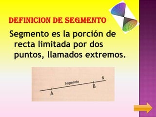 Este documento describe los diferentes tipos de segmentos en geometría, incluyendo segmentos nulos, consecutivos, alineados y la suma y resta de segmentos. También presenta tres ejemplos de problemas geométricos que involucran el cálculo de longitudes de segmentos dados otros datos.
