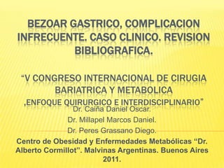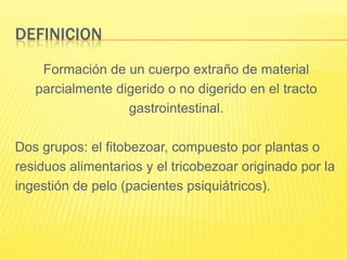 Una paciente de 54 años que había recibido un bypass gástrico laparoscópico 2 años antes presentó dolor abdominal, vómitos y distensión. Exámenes revelaron un fitobezoar gástrico de 7 cm que fue extraído endoscópicamente. Los bezoares gástricos son una complicación rara luego de cirugía bariátrica, causados por hipoclorhidria, disminución de la peristalsis y mala masticación. Generalmente los síntomas se presentan luego de 6 meses y se resuelven con extracción