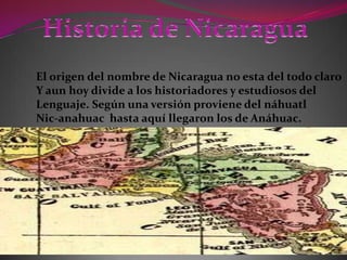 El origen del nombre de Nicaragua no está del todo claro y sigue dividiendo a los historiadores. El primer europeo en poner pie en Nicaragua fue Cristóbal Colón en 1502. Después de la independencia en 1821, Nicaragua estableció departamentos político-administrativos como Granada y León, y más tarde creó otros como Chinandega, Zelaya y Rivas.