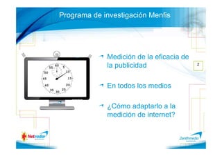 El documento describe un programa de investigación llamado Menfis que mide la eficacia de la publicidad en términos de recuerdo. Menfis ha medido la publicidad en televisión, cine, diarios, revistas y radio a lo largo de los años. Más recientemente, ha comenzado a medir la publicidad en internet mediante un estudio que registra la navegación de usuarios y mide su recuerdo de anuncios específicos. El estudio ha encontrado que el formato del anuncio afecta su visibilidad y recuerdo.