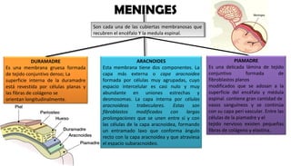 El documento resume las características de las meninges, el sistema ventricular y la irrigación encefálica. Las meninges son las membranas que recubren el encéfalo y médula espinal, incluyendo la duramadre, aracnoides y piamadre. El sistema ventricular incluye los ventrículos laterales, tercer ventrículo, acueducto cerebral y cuarto ventrículo. La irrigación encefálica ocurre a través de las arterias carótidas internas y vertebrales, con interconexiones a través del polígono