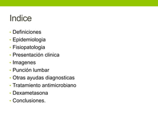 La meningitis bacteriana aguda es una inflamación de las meninges causada principalmente por Streptococcus pneumoniae y Neisseria meningitidis. Los síntomas incluyen fiebre, rigidez de nuca, cefalea y alteración del estado de conciencia. El diagnóstico se confirma mediante punción lumbar que muestra pleocitosis y cultivos positivos. El tratamiento consiste en antibióticos empíricos de amplio espectro y dexametasona para reducir daños neurológicos.