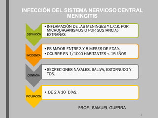 Este documento trata sobre la meningitis, específicamente definiéndola como la inflamación de las meninges y el LCR por microorganismos o sustancias extrañas. Explica que la incidencia es mayor entre los 3-8 meses de edad y que ocurre en 1 de cada 1000 habitantes menores de 15 años. Describe las vías de contagio, periodo de incubación, evolución y pronóstico, así como las vías de acceso a la infección. Además, explica la patogenia, etiología, clasificación, agentes