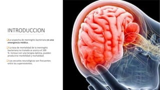 Este documento resume la meningitis bacteriana. Define la meningitis bacteriana como una inflamación de las meninges que rodean el cerebro y la médula espinal causada por bacterias. Explica los síntomas, factores de riesgo, diagnóstico, tratamiento y prevención de la meningitis bacteriana. Resalta que sin tratamiento, la tasa de mortalidad se acerca al 100% e incluso con tratamiento óptimo pueden ocurrir secuelas neurológicas.