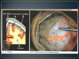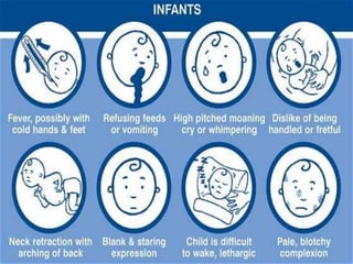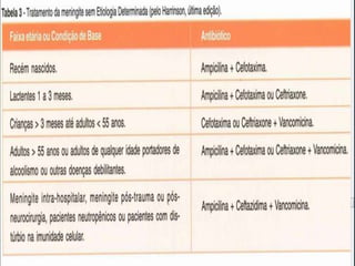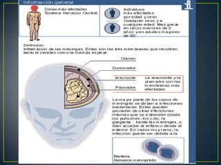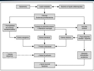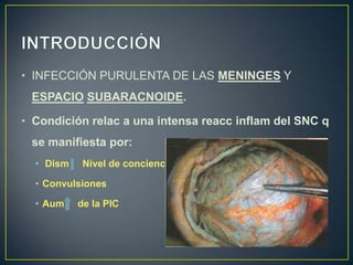 El documento aborda la meningitis bacteriana en pediatría, incluyendo su etiología, diagnóstico y tratamiento, destacando que la mayoría de los casos se presentan en niños de 1 mes a 5 años. Señala que el diagnóstico precoz y el tratamiento adecuado son cruciales para reducir la mortalidad y prevenir complicaciones. También se discuten las manifestaciones clínicas, la patogenia, y los diferentes gérmenes responsables según grupos de edad.